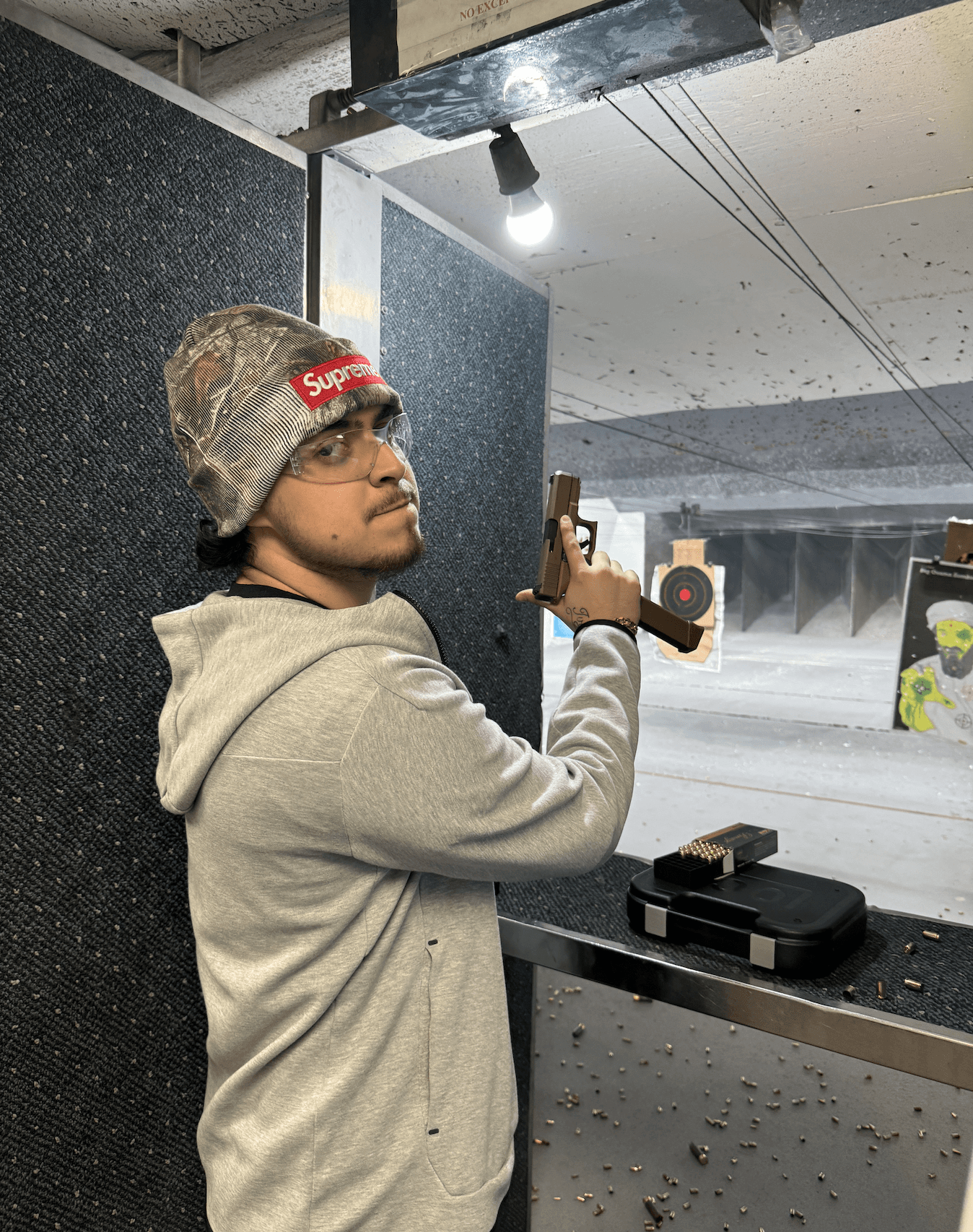 Perubaby, an artist who made his initial strides in music through brain-rotted Instagram reels and out-of-pocket lyrics, doesn’t talk like someone chasing validation or instant stardom. Although unconventional, Perubaby insisted that we would conduct this interview at a shooting range. He had been itching to shoot his Coyote Tan Glock 19X Gen5, which he had purchased only a couple of months prior. At the range, his mind is clear and focused, and he felt these were the conditions he needed to do this interview. Naturally, I was happy to accommodate.