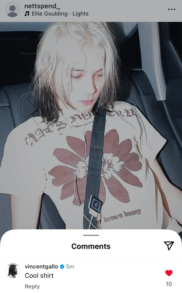 Six months ago, Nettspend uploaded a photo where he's wearing a T-shirt of the infamously controversial movie, The Brown Bunny. Chloë Sevigny, who Nettspend has also shown an affinity for, stars in the film. Vincent Gallo, the director/editor/producer/star of The Brown Bunny commented "Cool shirt after being tagged by a fan. Gallo has a long and rich history in the world of art that spans decades as well as mediums. Who is he and why are he and his work considered controversial?
