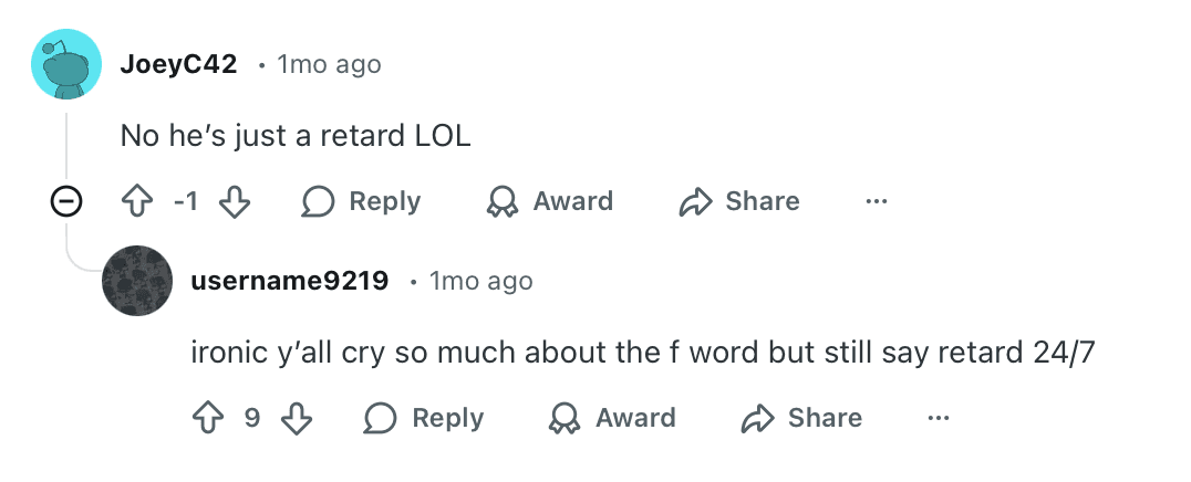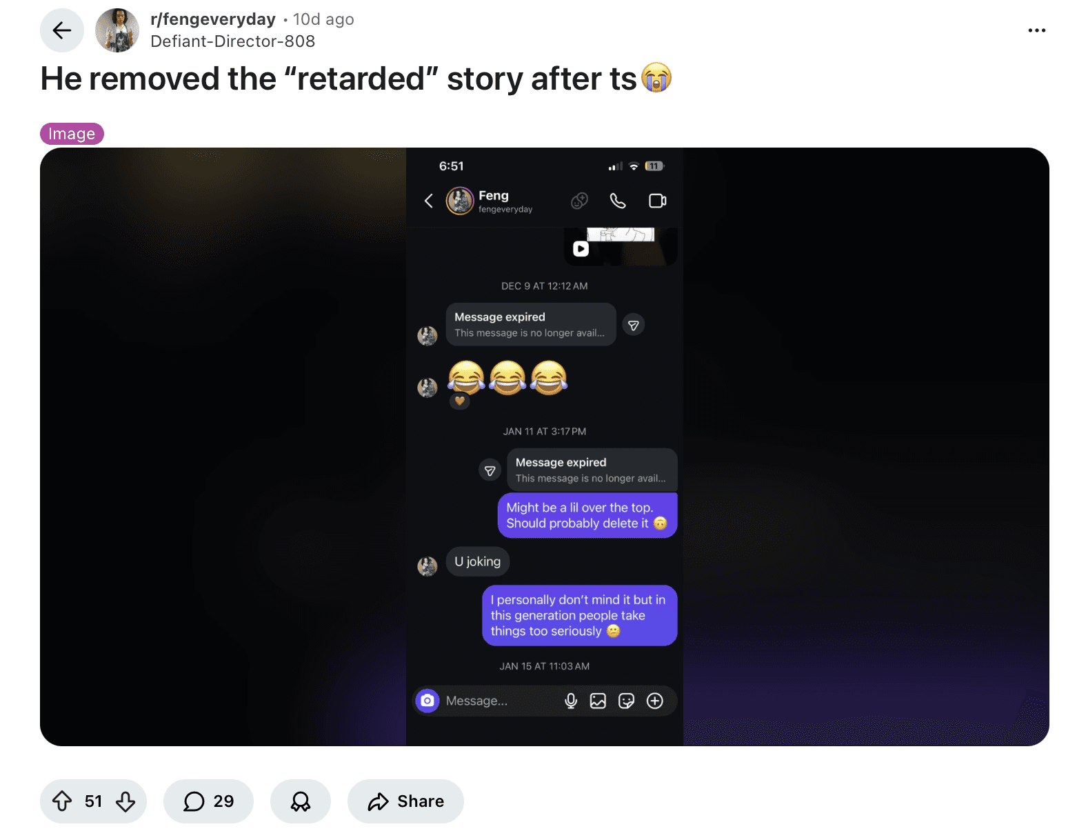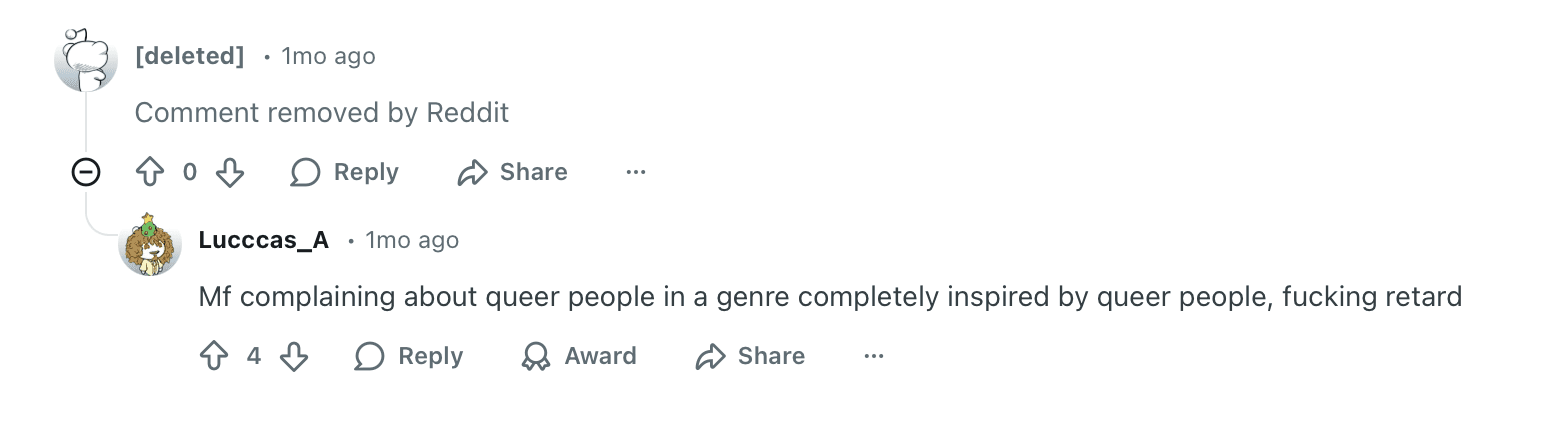 A user on Reddit recently shared a DM with Feng, where he suggested the artist take down a story post that also contained the word retard; Feng did end up deleting the post. In the past, use of the word “retard” was widely condemned, yet it has seen a resurgence in the last few years. For whatever reason, it is a word that is deemed a slur yet not as heavily scrutinized as others.